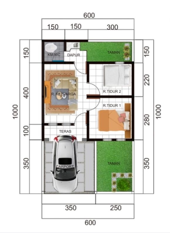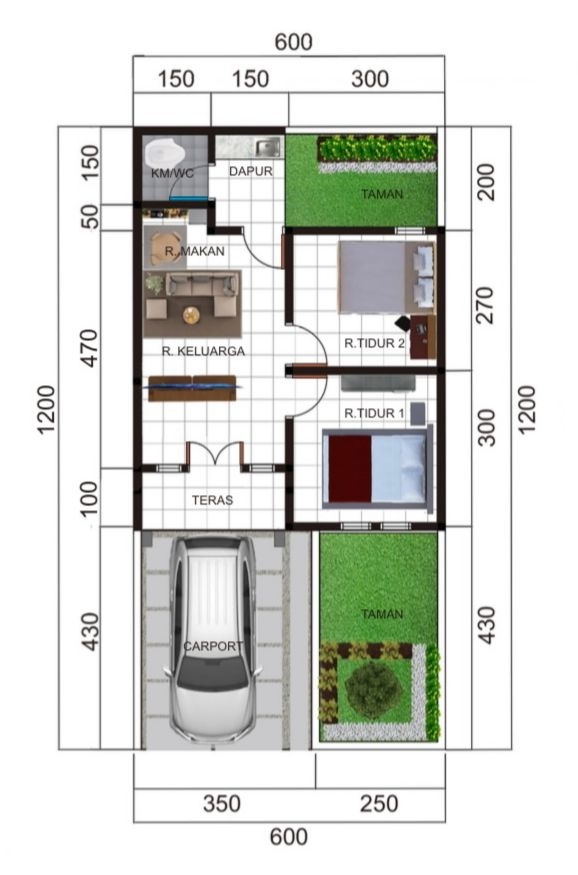 1300 WattTipe Kanaya : Double Dinding • 2 Kamar Tidur • 1 Kamar Mandi • Carport